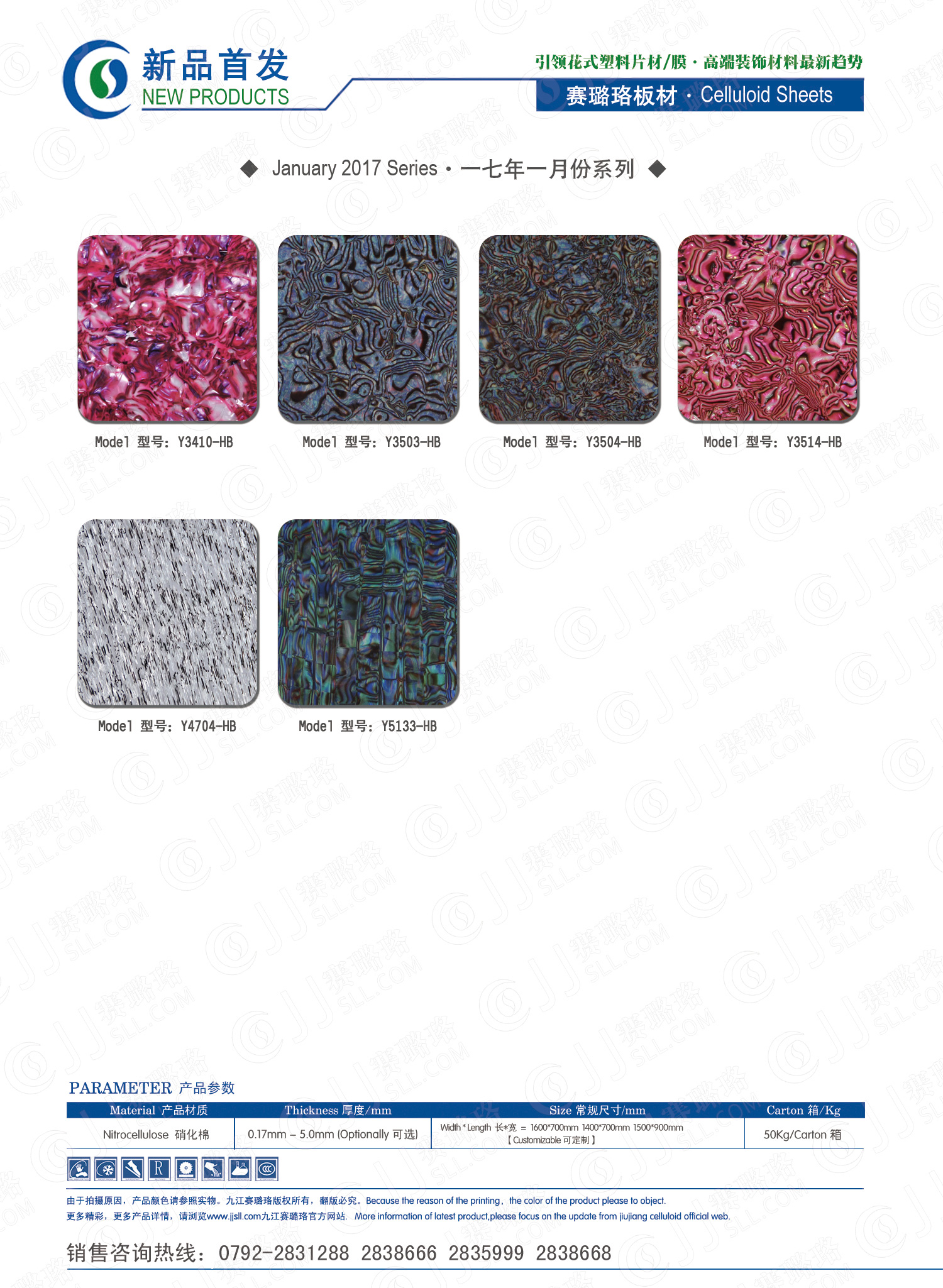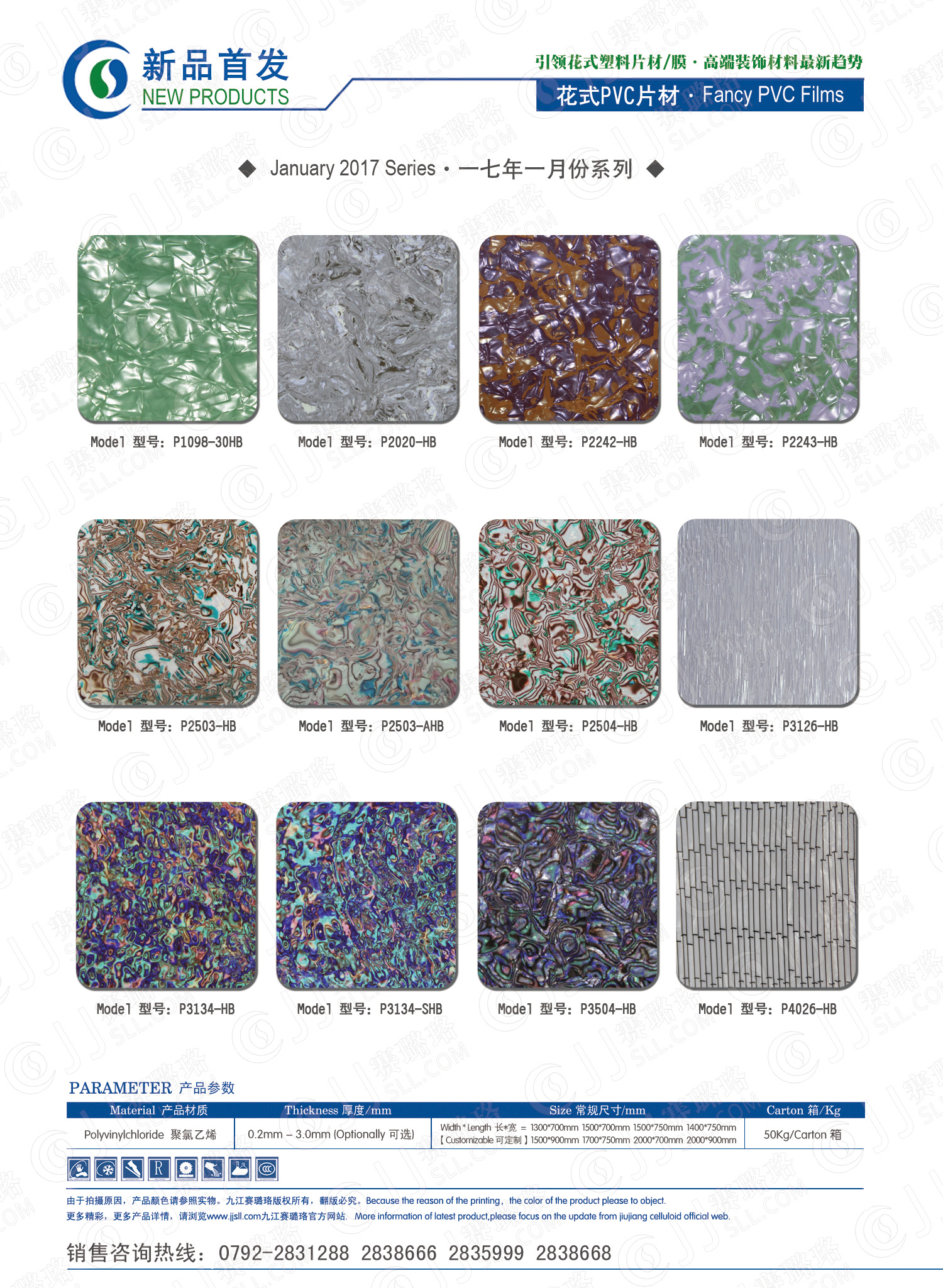 九江賽璐珞實業有限公司2017年一月份賽璐珞板材、瑪瑙膜、理石膜、樂器裝飾材料、花式PVC片材新品發布,花式塑料片材/膜·多彩裝飾材料先驅者。咨詢熱線:0792-2838668 / 2838666 / 2835999。點擊圖片查看詳細產品