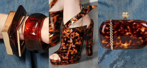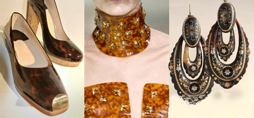 堅韌的玳瑁以其獨特的硬度自然的在這個春夏的配飾表現(xiàn)出未來派的金屬質(zhì)感。Apologie的兩款硬質(zhì)玳瑁鞋子,嘗試軟木鞋跟與金色斑點的結(jié)合。Alexander McQueen 的項鏈和Trocadero的仿古耳飾設(shè)計都將女性的細(xì)節(jié)與玳瑁的堅硬完美結(jié)合。