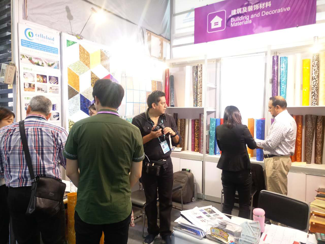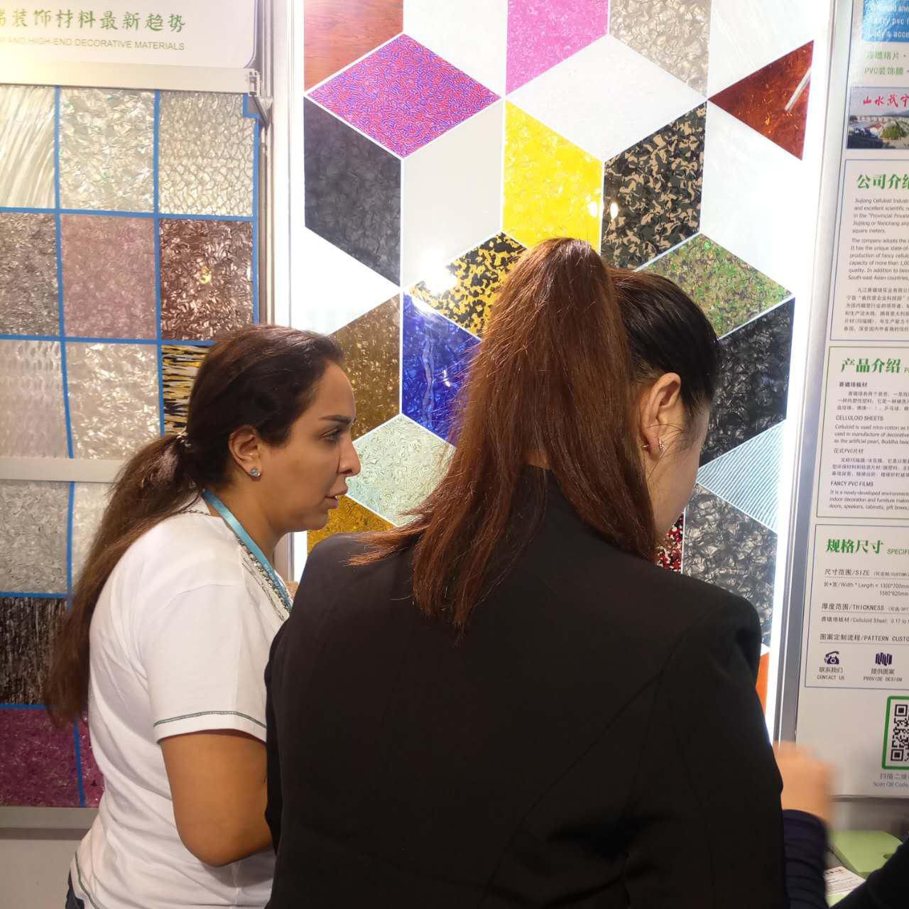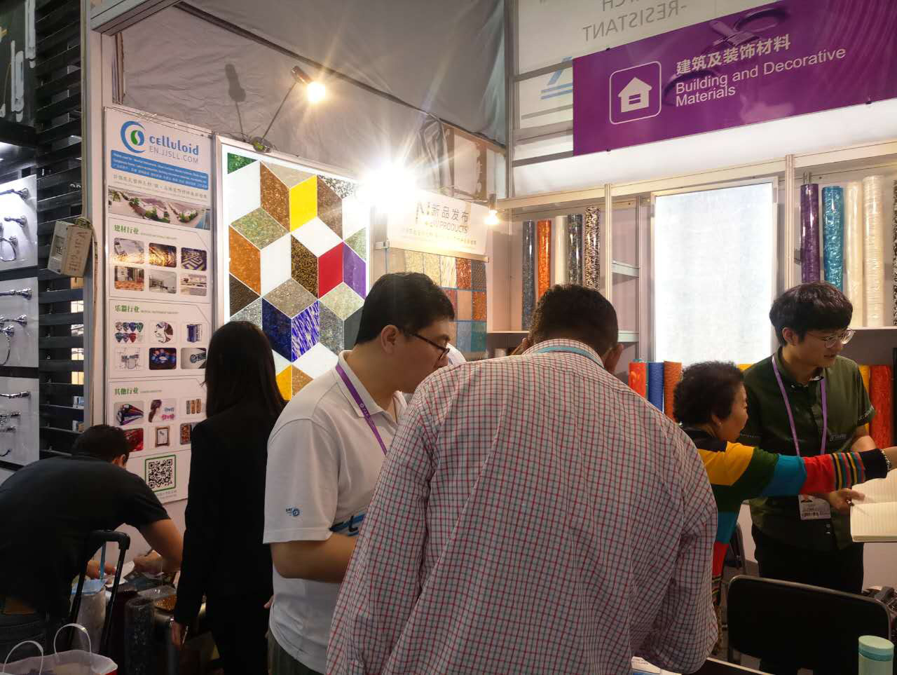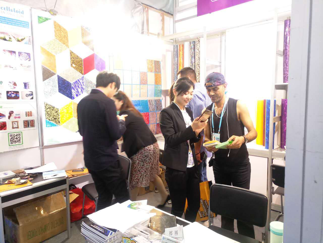我司本屆主要展出:賽璐珞片,PVC裝飾膜及PC幻彩膜三大系列產(chǎn)品,繼上屆推出PC幻彩膜后,本屆又推出彩云、幻彩、貝殼、花式等多款系列新品,獲得了大量的國外客戶的關(guān)注和青睞。